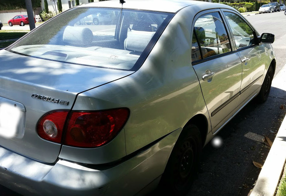 Below in the garage of this building in which I reside sits the Teenage-mobile.  A 2003 silver Corolla – owning no hubcaps, doors dented, back bumper askew, scrapes and scratches, with a total of 253,080 miles to its name – well, as of today.